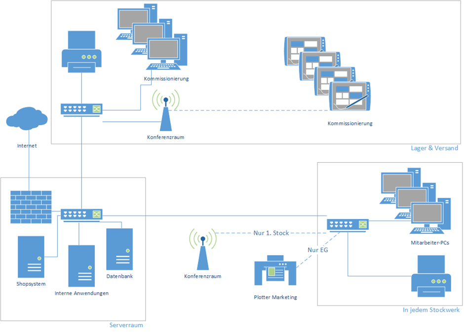 Das Wachstum des Unternehmens zog ein wachsendes IT-System mit sich. Es ist an vielen Stellen nicht mehr auf der Höhe der Zeit, obwohl die IT-Leiterin versucht, moderne Technologien einzusetzen, wo es ihr sinnvoll erscheint. So werden derzeit zusätzlich zur klassischen Kommissionierung mit gedruckten Kommisionierungsaufträgen Tablets erprobt, mit denen u.a. der Auftrag live getrackt, auf Lager befindliche Stückzahlen besser überwacht und die Wege verkürzt werden können. Aber immer noch passt vieles nicht richtig zusammen, an mehreren Stellen behindern veraltete Hard- und Software effiziente Arbeitsprozesse. Man möchte daher nun die Unternehmens-IT endlich umfangreich modernisieren.